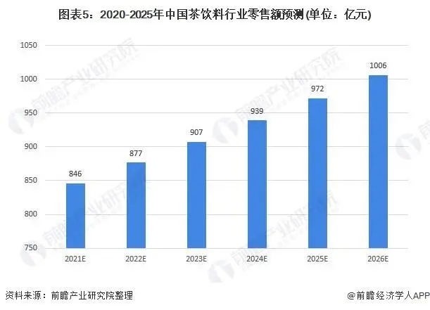 隨著中國人民生活水平及支付能力的不斷提高,人們越來越關注自身的健康。茶飲料中茶的健康形象成為消費者選購該類產品的一個重要動力。預計到2026年我國茶飲料行業零售額將達到千億元以上,約1006億元。